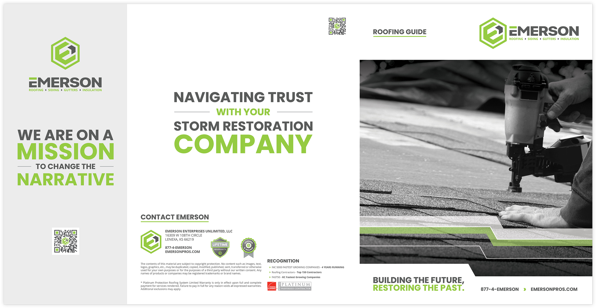 Emerson is in the process of simplifying our approach to our Restoration Guide. Instead of one large guide, we are breaking the content down to four easier to digest guides for our homeowners to understand. Each guide will be presented during different phases of our process.